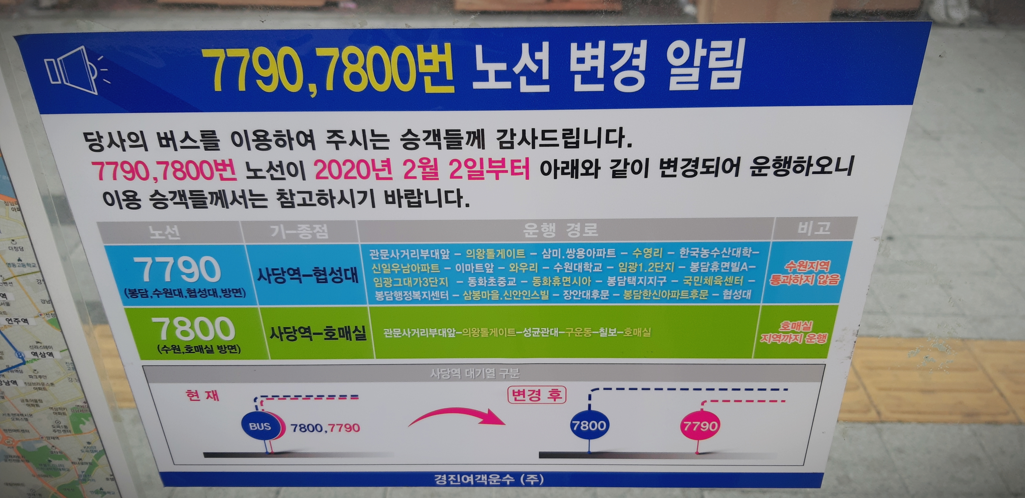 7790 7800 8155 8156 기존 사당역 4번출구에서 사당역 9번출구로 버스 타는 위치가 바뀌었다.