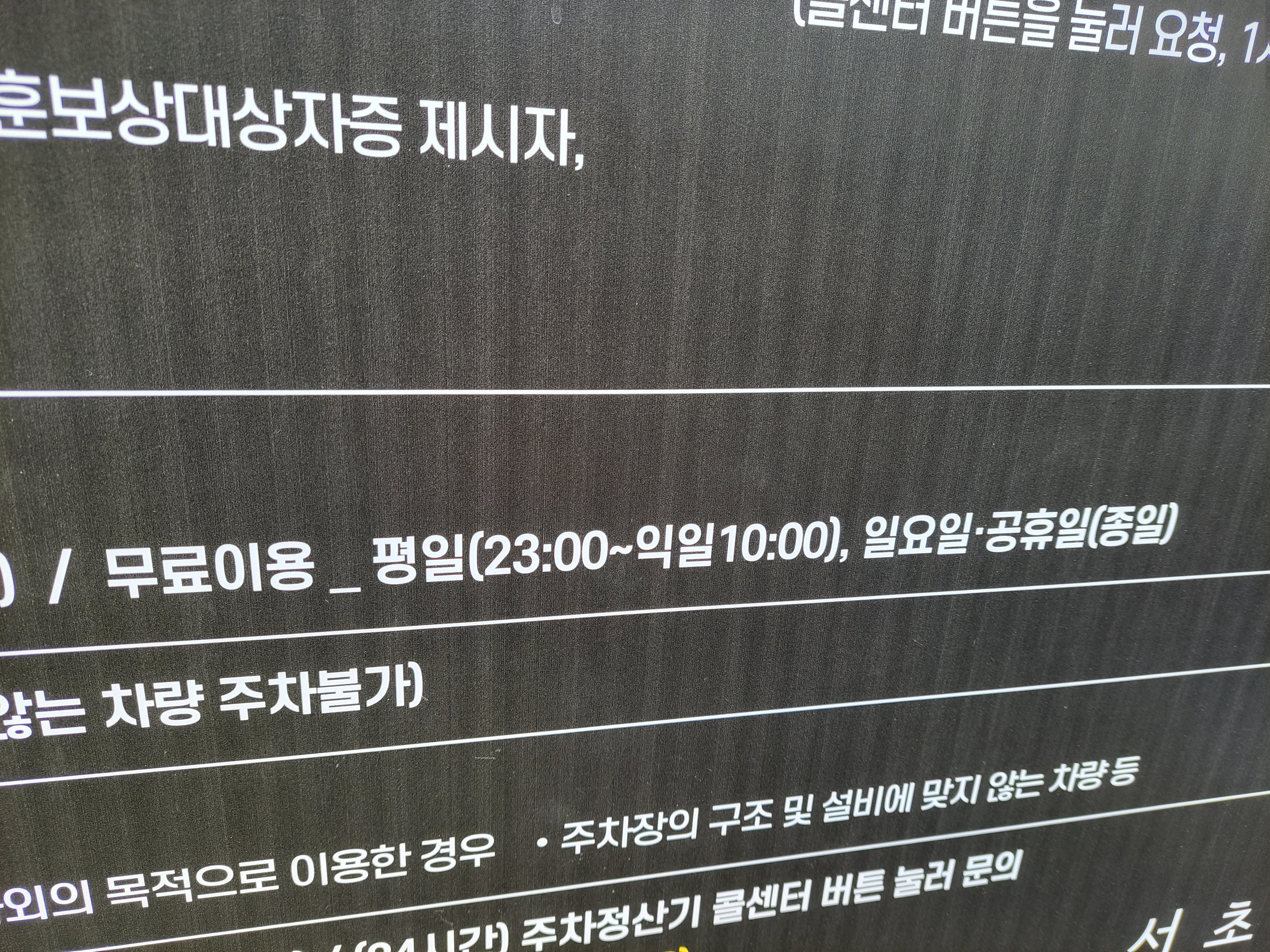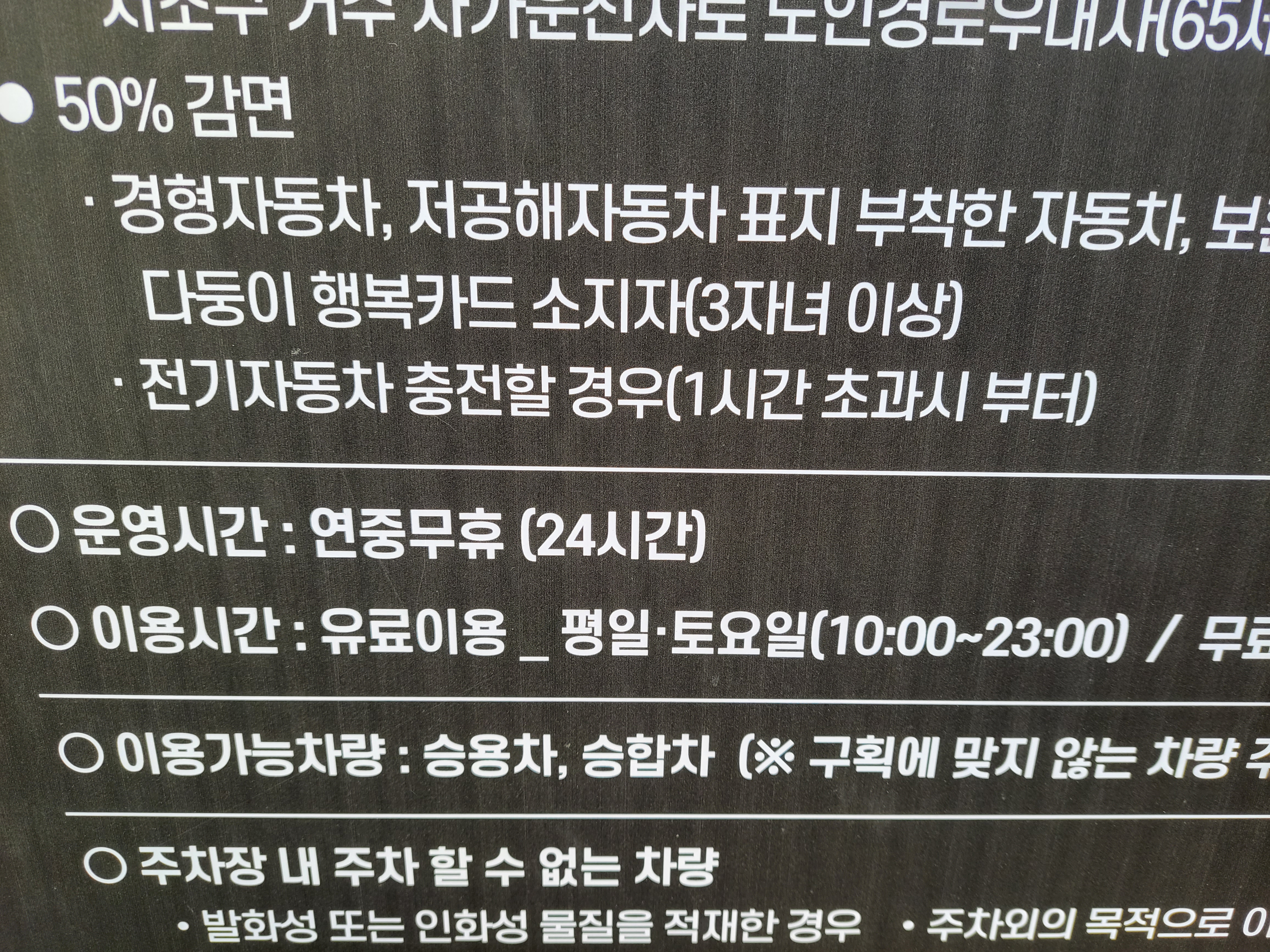그래서 무료주차를 하고 싶으면 평일이나 토요일 저녁 11시 (23시) 이후에 들어가면 되고 일요일이나 공휴일에는 아무 때나 들어가도 무료이다.